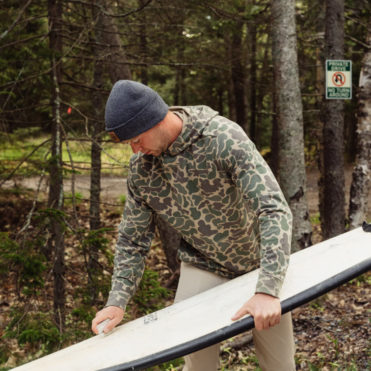 Featuring a snap button closure for easy layering, a kangaroo pouch pocket to keep your hands warm, and a woven label for that signature Marsh Wear touch. The sublimated print adds a subtle, rugged style that looks right at home by the campfire, on the water, or around town.