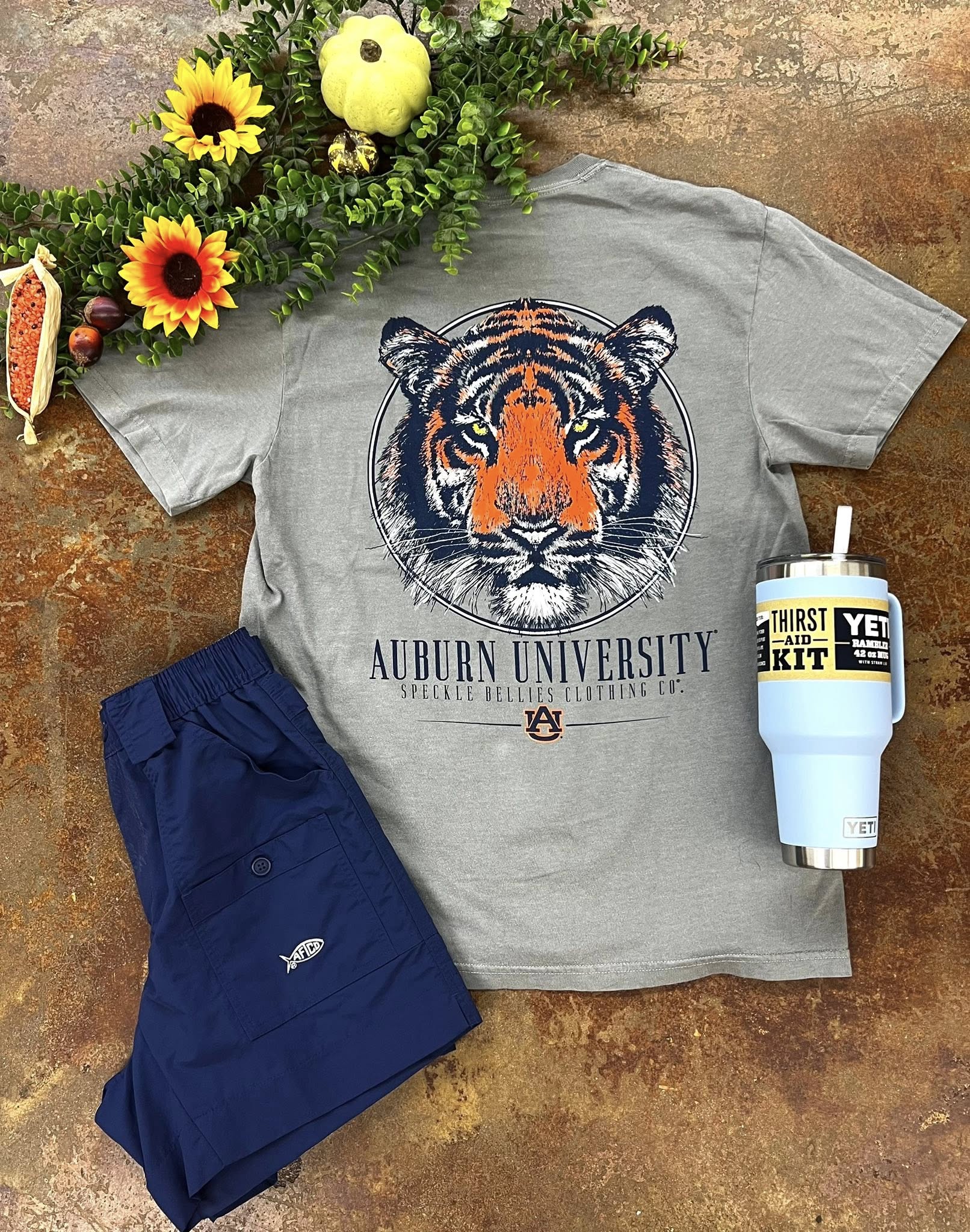 Bring the Auburn spirit everywhere you go with the Speckle Bellies Auburn Tiger Head Tee. Featuring the iconic Tiger Head design on a classic Comfort Colors short sleeve tee, this shirt delivers unbeatable comfort with timeless Auburn pride. Perfect for game days, campus, or casual weekends.